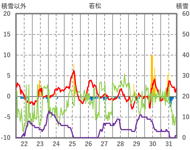 | 日 | 時 | 気温 | 降水 | 風向/風速 | 日照 | 積雪 | 降雪 |