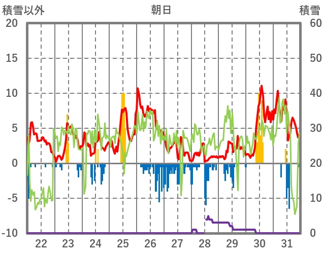 | 日 | 時 | 気温 | 降水 | 風向/風速 | 日照 | 積雪 | 降雪 |