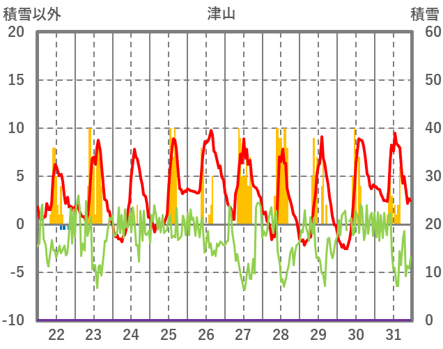 | 日 | 時 | 気温 | 降水 | 風向/風速 | 日照 | 積雪 | 降雪 |