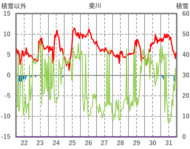 | 日 | 時 | 気温 | 降水 | 風向/風速 | 日照 | 積雪 | 降雪 |