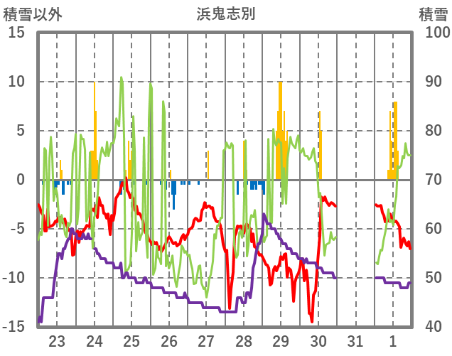 | 日 | 時 | 気温 | 降水 | 風向/風速 | 日照 | 積雪 | 降雪 |