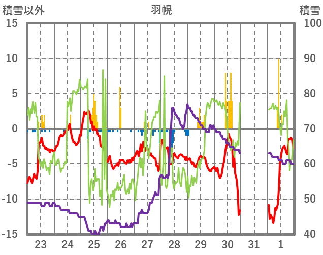 | 日 | 時 | 気温 | 降水 | 風向/風速 | 日照 | 積雪 | 降雪 |