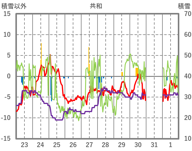 | 日 | 時 | 気温 | 降水 | 風向/風速 | 日照 | 積雪 | 降雪 |