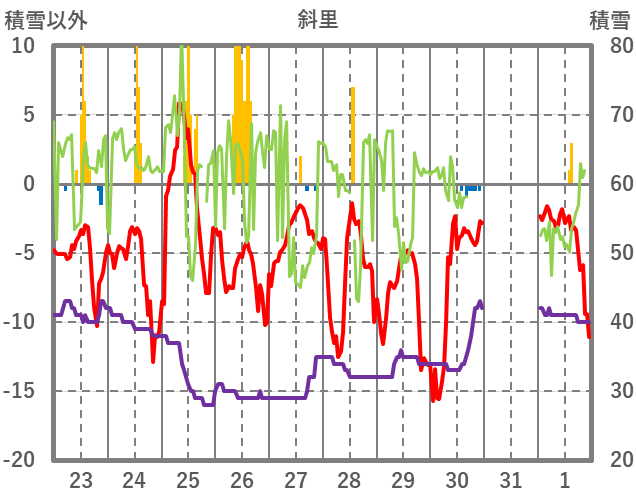 | 日 | 時 | 気温 | 降水 | 風向/風速 | 日照 | 積雪 | 降雪 |
