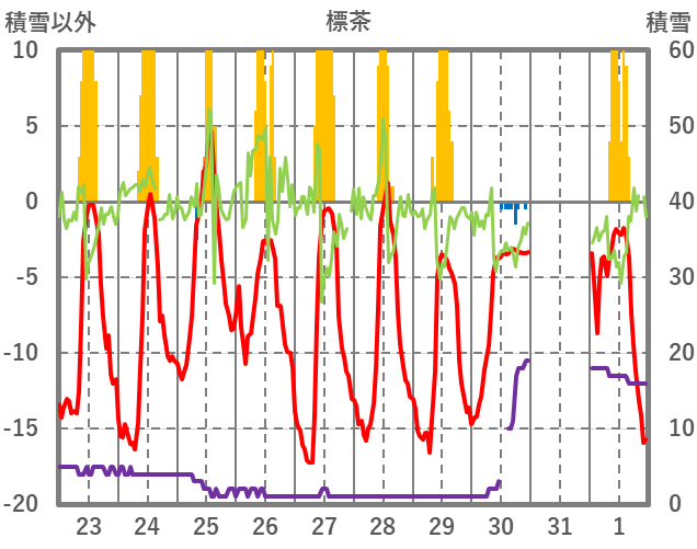 | 日 | 時 | 気温 | 降水 | 風向/風速 | 日照 | 積雪 | 降雪 |