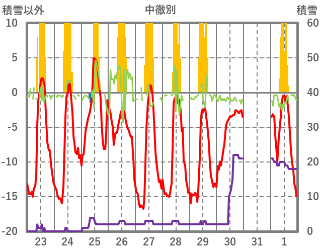 | 日 | 時 | 気温 | 降水 | 風向/風速 | 日照 | 積雪 | 降雪 |