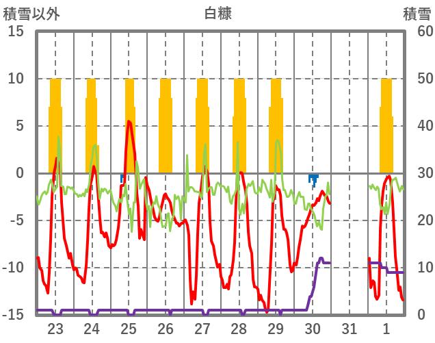 | 日 | 時 | 気温 | 降水 | 風向/風速 | 日照 | 積雪 | 降雪 |