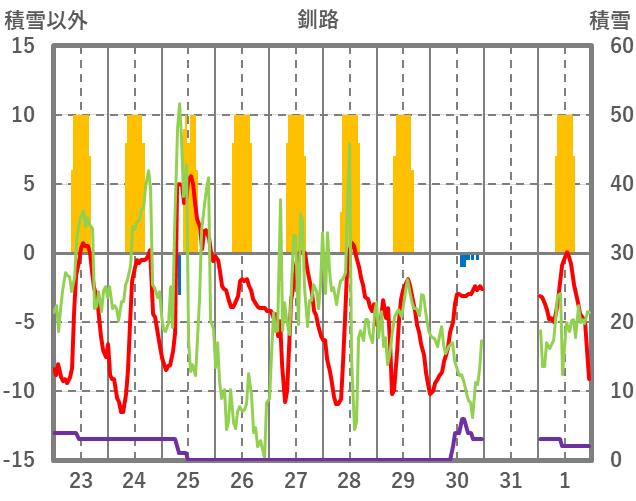 | 日 | 時 | 気温 | 降水 | 風向/風速 | 日照 | 積雪 | 降雪 |