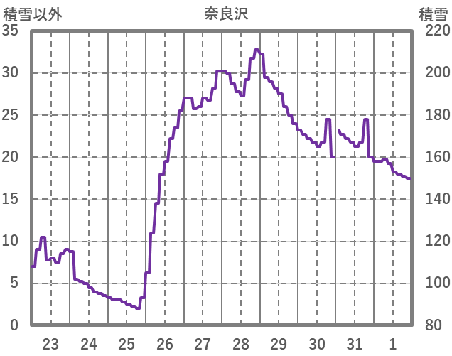 | 日 | 時 | 気温 | 降水 | 風向/風速 | 日照 | 積雪 | 降雪 |