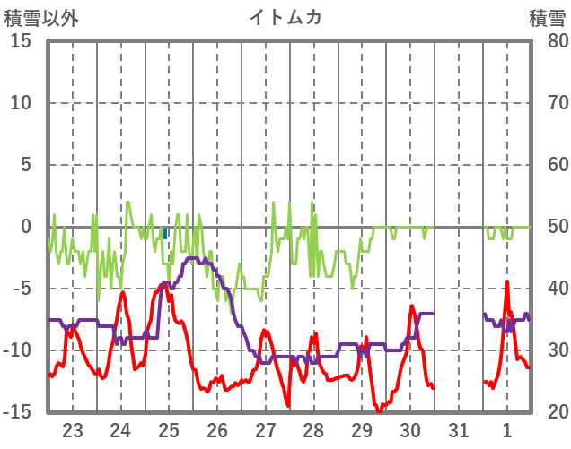 | 日 | 時 | 気温 | 降水 | 風向/風速 | 日照 | 積雪 | 降雪 |
