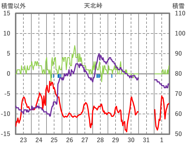 | 日 | 時 | 気温 | 降水 | 風向/風速 | 日照 | 積雪 | 降雪 |