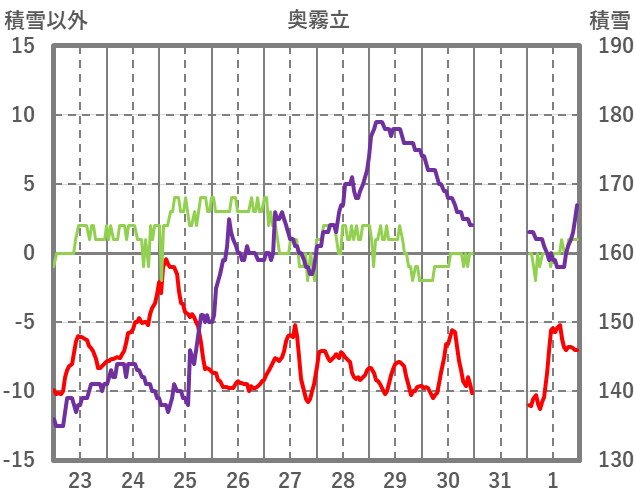 | 日 | 時 | 気温 | 降水 | 風向/風速 | 日照 | 積雪 | 降雪 |