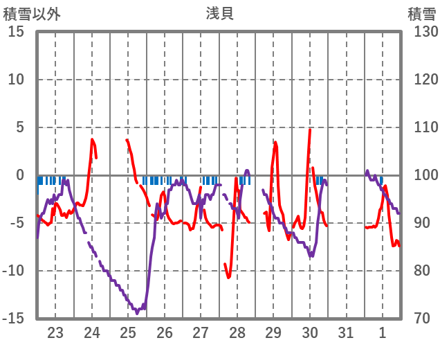 | 日 | 時 | 気温 | 降水 | 風向/風速 | 日照 | 積雪 | 降雪 |