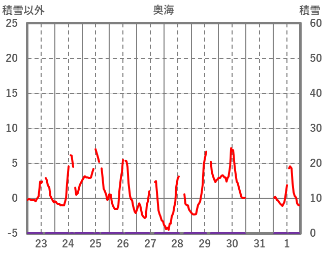 | 日 | 時 | 気温 | 降水 | 風向/風速 | 日照 | 積雪 | 降雪 |