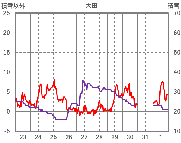 | 日 | 時 | 気温 | 降水 | 風向/風速 | 日照 | 積雪 | 降雪 |