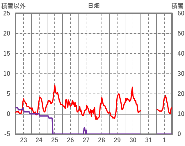| 日 | 時 | 気温 | 降水 | 風向/風速 | 日照 | 積雪 | 降雪 |