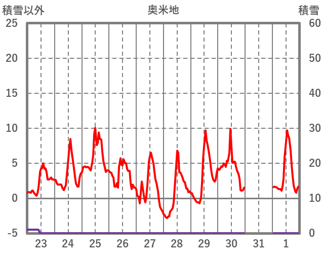 | 日 | 時 | 気温 | 降水 | 風向/風速 | 日照 | 積雪 | 降雪 |