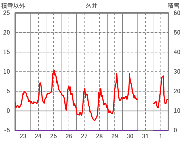 | 日 | 時 | 気温 | 降水 | 風向/風速 | 日照 | 積雪 | 降雪 |