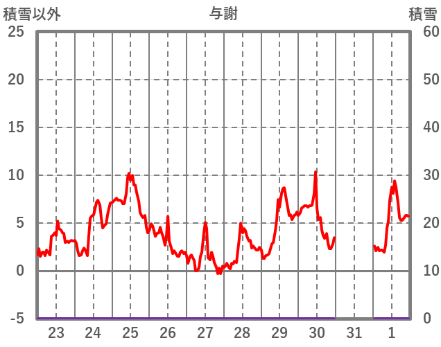 | 日 | 時 | 気温 | 降水 | 風向/風速 | 日照 | 積雪 | 降雪 |