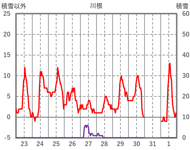 | 日 | 時 | 気温 | 降水 | 風向/風速 | 日照 | 積雪 | 降雪 |