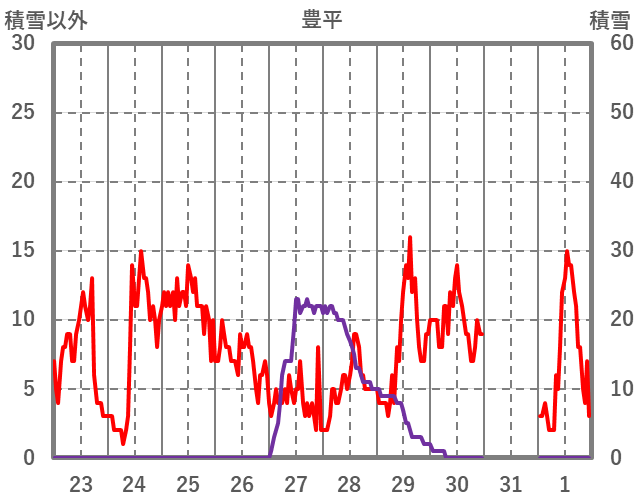 | 日 | 時 | 気温 | 降水 | 風向/風速 | 日照 | 積雪 | 降雪 |
