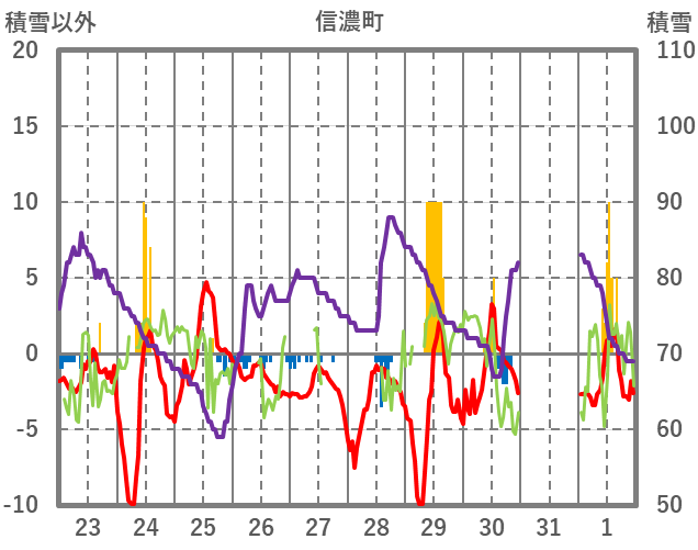 | 日 | 時 | 気温 | 降水 | 風向/風速 | 日照 | 積雪 | 降雪 |