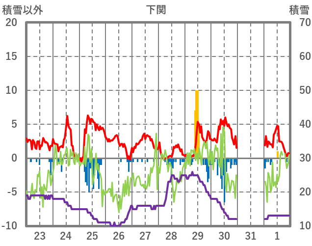 | 日 | 時 | 気温 | 降水 | 風向/風速 | 日照 | 積雪 | 降雪 |