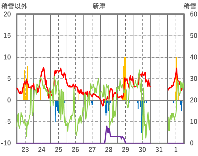 | 日 | 時 | 気温 | 降水 | 風向/風速 | 日照 | 積雪 | 降雪 |
