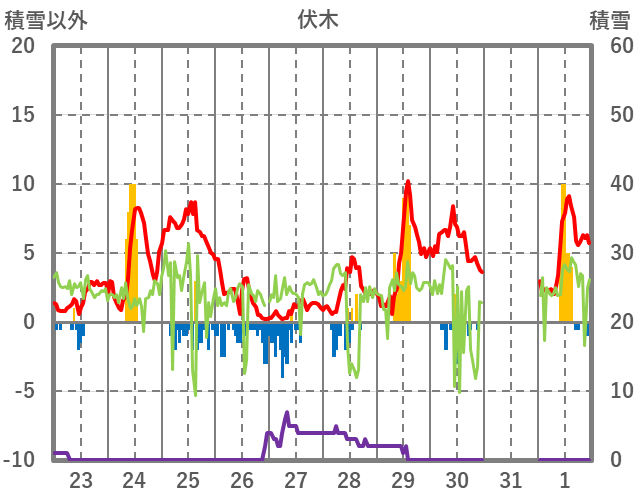 | 日 | 時 | 気温 | 降水 | 風向/風速 | 日照 | 積雪 | 降雪 |