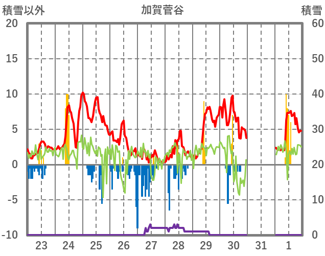 | 日 | 時 | 気温 | 降水 | 風向/風速 | 日照 | 積雪 | 降雪 |
