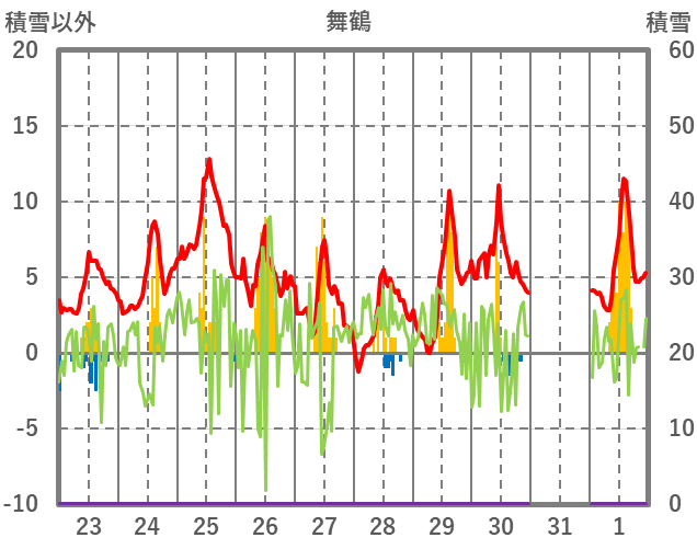 | 日 | 時 | 気温 | 降水 | 風向/風速 | 日照 | 積雪 | 降雪 |