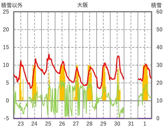 | 日 | 時 | 気温 | 降水 | 風向/風速 | 日照 | 積雪 | 降雪 |