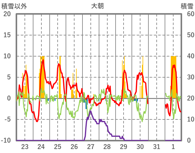 | 日 | 時 | 気温 | 降水 | 風向/風速 | 日照 | 積雪 | 降雪 |