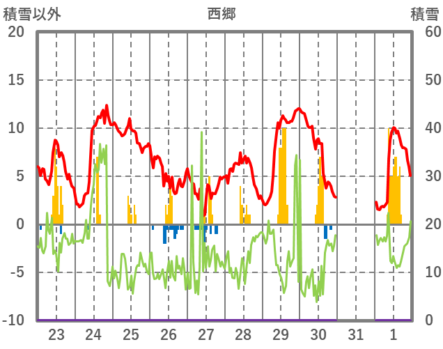 | 日 | 時 | 気温 | 降水 | 風向/風速 | 日照 | 積雪 | 降雪 |