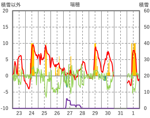 | 日 | 時 | 気温 | 降水 | 風向/風速 | 日照 | 積雪 | 降雪 |
