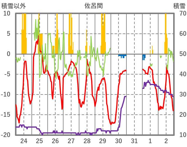 | 日 | 時 | 気温 | 降水 | 風向/風速 | 日照 | 積雪 | 降雪 |