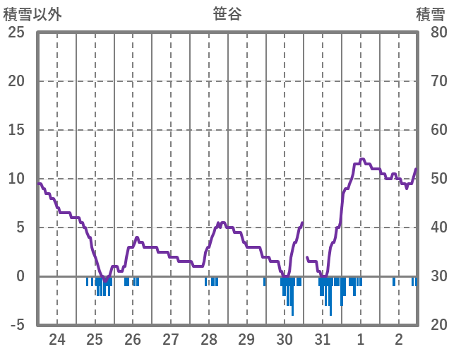 | 日 | 時 | 気温 | 降水 | 風向/風速 | 日照 | 積雪 | 降雪 |