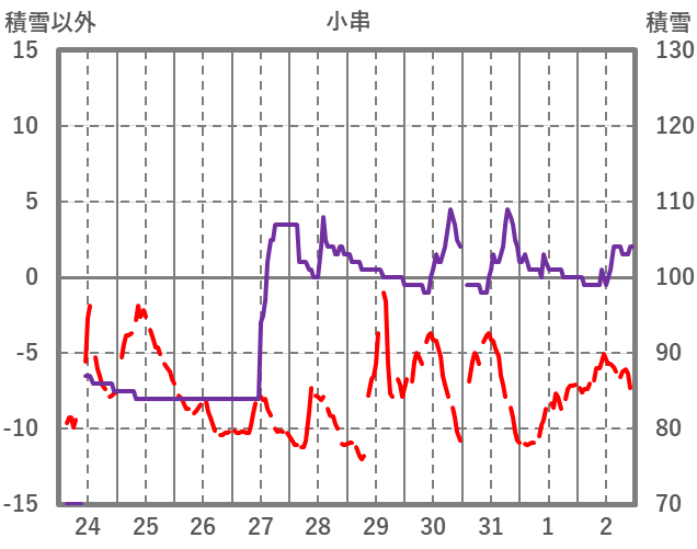 | 日 | 時 | 気温 | 降水 | 風向/風速 | 日照 | 積雪 | 降雪 |