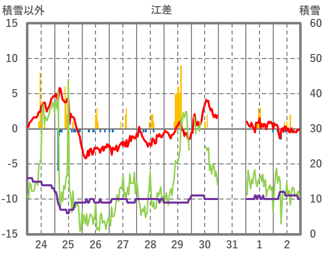 | 日 | 時 | 気温 | 降水 | 風向/風速 | 日照 | 積雪 | 降雪 |