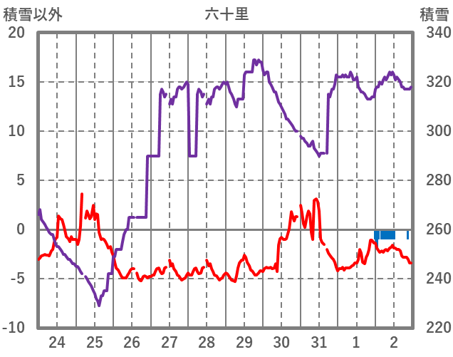 | 日 | 時 | 気温 | 降水 | 風向/風速 | 日照 | 積雪 | 降雪 |