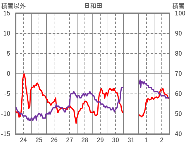 | 日 | 時 | 気温 | 降水 | 風向/風速 | 日照 | 積雪 | 降雪 |