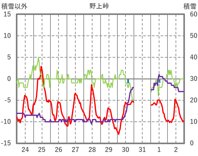 | 日 | 時 | 気温 | 降水 | 風向/風速 | 日照 | 積雪 | 降雪 |