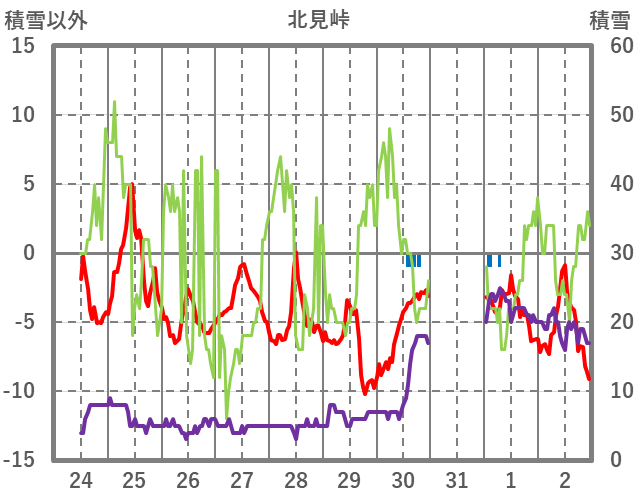 | 日 | 時 | 気温 | 降水 | 風向/風速 | 日照 | 積雪 | 降雪 |