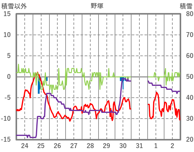 | 日 | 時 | 気温 | 降水 | 風向/風速 | 日照 | 積雪 | 降雪 |