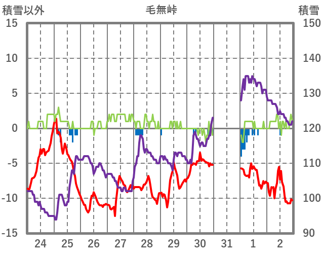 | 日 | 時 | 気温 | 降水 | 風向/風速 | 日照 | 積雪 | 降雪 |