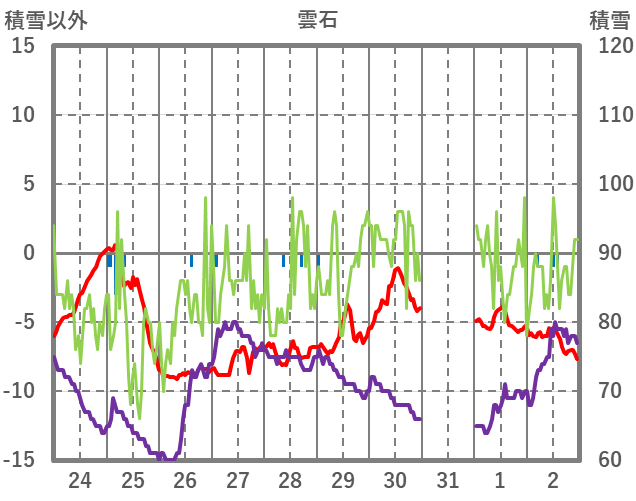 | 日 | 時 | 気温 | 降水 | 風向/風速 | 日照 | 積雪 | 降雪 |