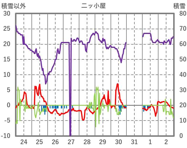| 日 | 時 | 気温 | 降水 | 風向/風速 | 日照 | 積雪 | 降雪 |