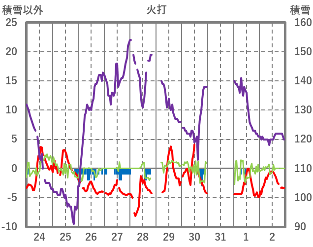 | 日 | 時 | 気温 | 降水 | 風向/風速 | 日照 | 積雪 | 降雪 |