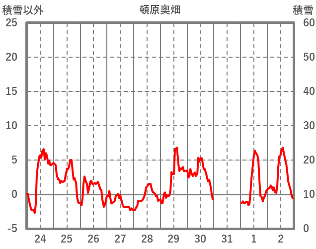 | 日 | 時 | 気温 | 降水 | 風向/風速 | 日照 | 積雪 | 降雪 |
