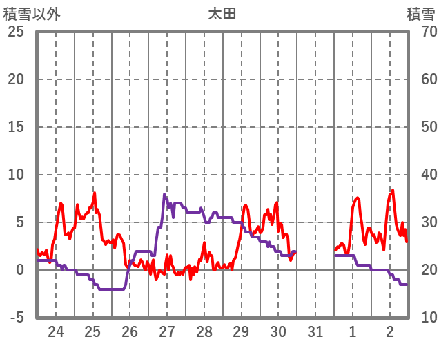 | 日 | 時 | 気温 | 降水 | 風向/風速 | 日照 | 積雪 | 降雪 |